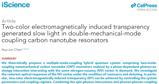 光电物理系教师陈华俊以唯一作者身份在Cell子刊iScience发表题为《Two-color electromagnetically induced transparency generated slow light in doublemechanical- mode coupling carbon nanotube resonators》的论文,安徽理工大学为唯一完成单位。