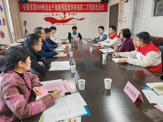 在明道楼A320为造血干细胞捐献者许梓强二次赴合肥捐献举行欢送会。淮南市红十字会常务副会长陈玉琴、校学生处副处长刘瑞、校团委副书记(兼职)张瑞、澳门六合彩三中三