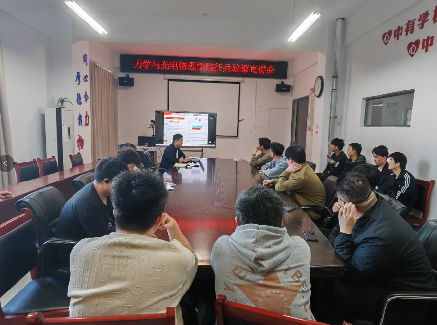楼A320会议室召开征兵工作推进会暨征兵重点对象政策宣讲会。此次会议采取线上线下相结合的方式,特别邀请了毕业生家长通过腾讯会议的方式参加。