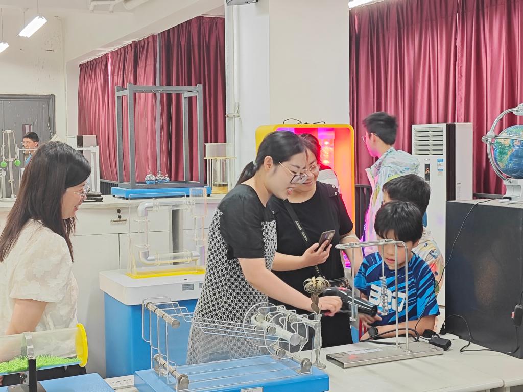 实验中心教工党支部的老师们热心为孩子们讲解科普实验现象背后的物理原理,并指导他们动手体验,使得科学知识的传授变得生动有趣。