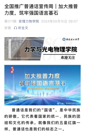 师生利用主题班会、公众号、展板等多种渠道,广泛宣传国家语言文字法律法规,努力营造和形成人人讲普通话、个个写规范字的良好氛围和行动自觉。