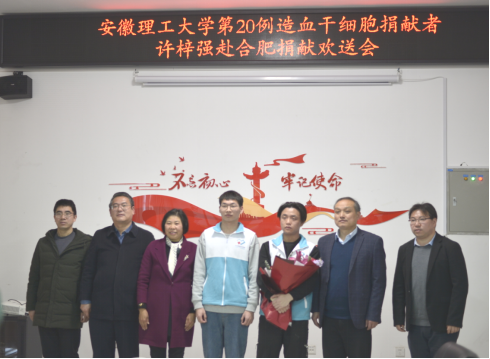 2月27日上午,淮南市红十字会联合安徽理工大学在明道楼A318举行造血干细胞捐献者许梓强同学赴合肥捐献欢送仪式。淮南市红十字会常务副会长陈玉琴、校团委副书记朱梁、安徽理工大学第18例捐献者冯魏、志愿者代表、国寿财险公司负责人及澳门六合彩三中三