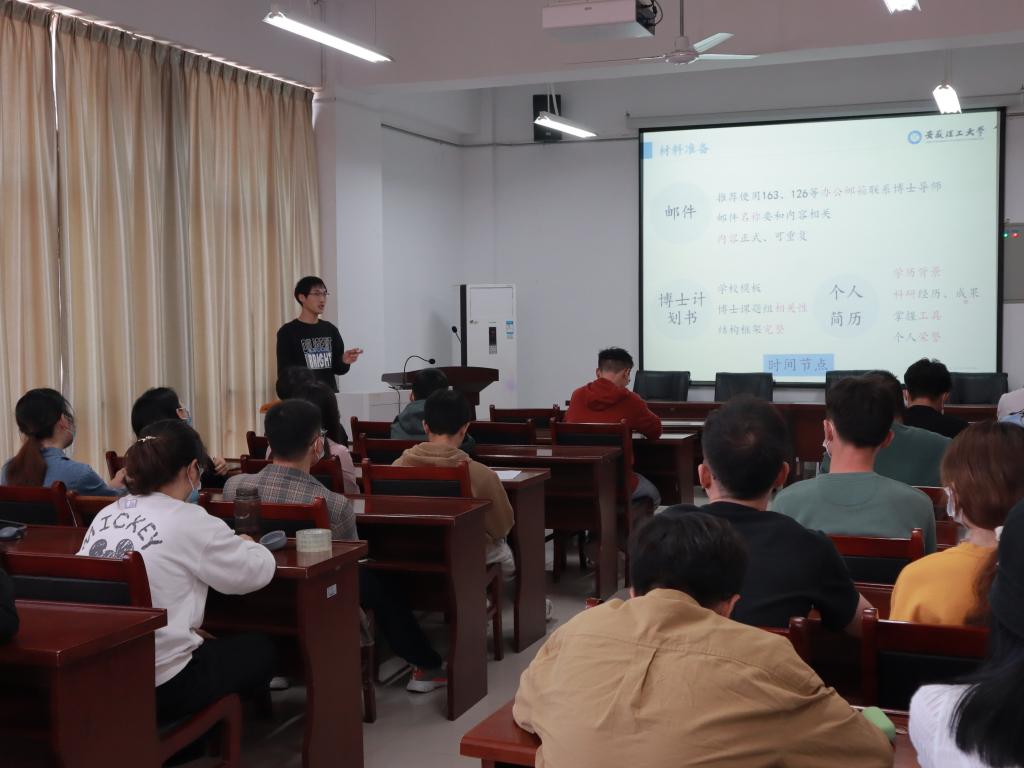 紧接着,两位考博成功上岸的学长依次作经验分享。刘云开,考入华中科技大学,他重点就报名时间、学校的选择、导师的选择、考博要求和流程等大家关注的问题做了详细的阐述,鼓励大家在硕士期间多发表高水平论文。殷允桥,考入苏州大学,他展示了三年来取得的优秀学术成果,结合自身实际情况着重讲述了考博原因和报考过程中的关键步骤,鼓励同学们加强英语的学习,同时做好科研工作。在随后的提问环节中,大家纷纷就自己关心和疑惑的地方提出问题,两位学长一一解答,现场气氛十分热烈。