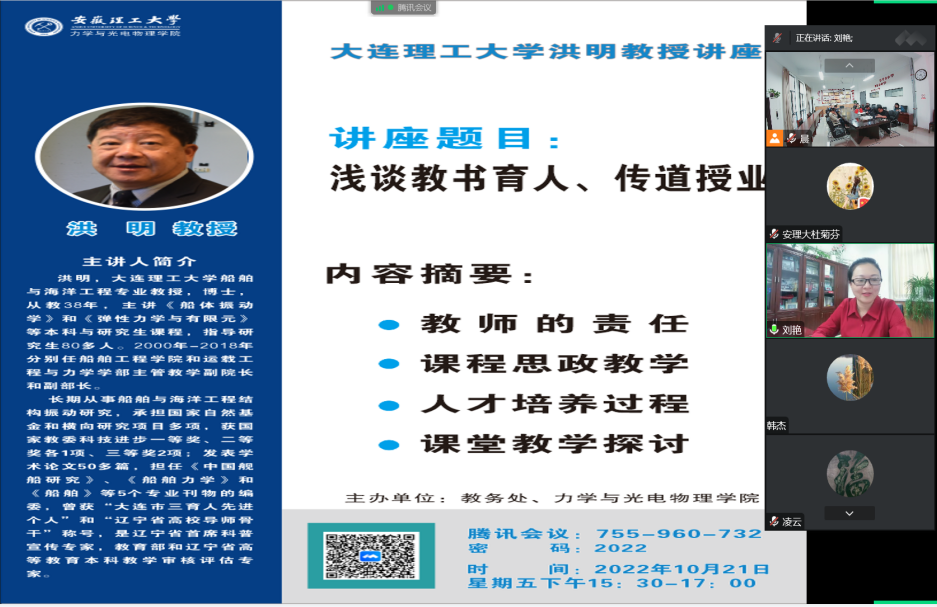 的邀请,10月21日下午,大连理工大学洪明教授为我校教师作了题为《浅谈教书育人、传道授业》的线上报告。报告会由澳门六合彩三中三