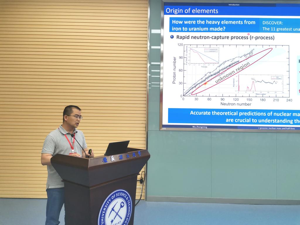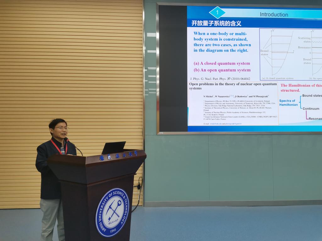 固体物理所杨勇研究员、中国科学技术大学龚明教授分别作《基于图深度学习加速的晶体结构预测方法发展》、《Simulating Non-Hermitian Physics》、《Ripples of the QCD critical point》、《开放量子系统的理论发展与奇特核研究》、《r-过程研究中原子核质量与β衰变寿命的理论描述》、《极端条件下的QCD物质》、《Polarization Dynamics in Paramagnet of Charged Quark-gluon Plasma》、《量子隧穿和最小空间尺度的存在性》和《准周期模型中的安德森局域化和临界相》的精彩报告。并同与会专家、师生进行了积极交流探讨。会议现场学术氛围浓厚、气氛热烈。会议于25日上午闭幕,王群教授致闭幕辞。