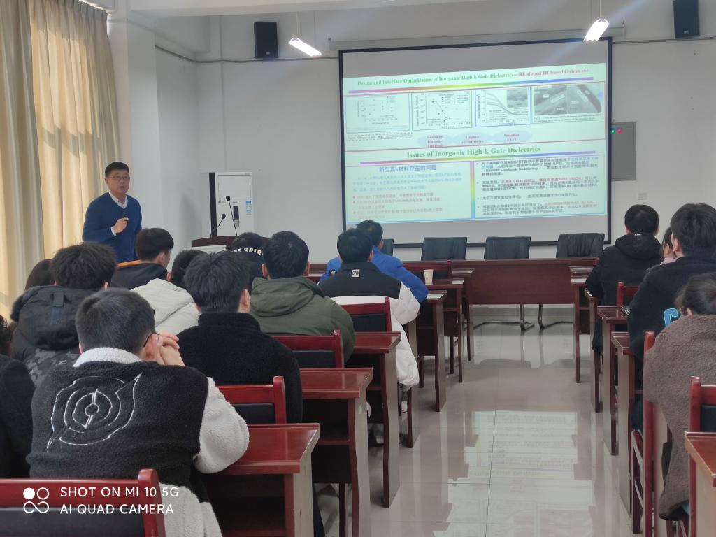 做学术交流,并分别做了题为“新型高k栅的界面工程与应用探索”和“柔性锌空电池及超级电容器能源存储器件设计与构筑”的学术讲座。报告会由副院长高娟教授主持,部分青年教师以及研究生共计80余人参加了报告会。
