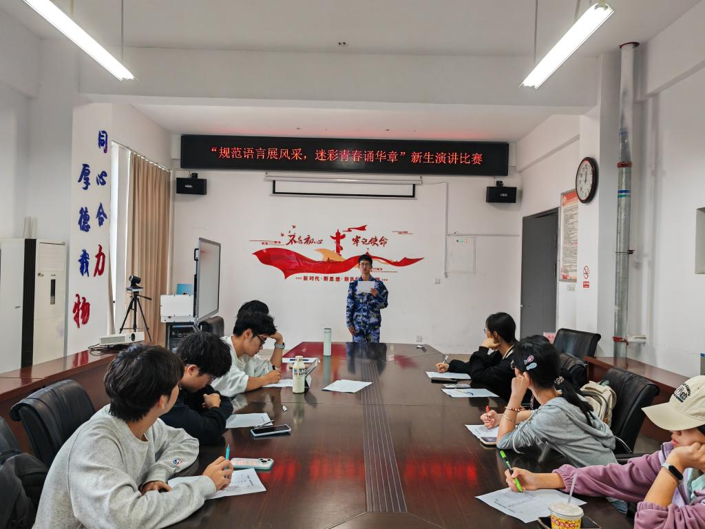 在明道楼A320举办“规范语言展风采,迷彩青春诵华章”新生演讲比赛,10名2025级新生结合大学初体验与军训感悟,以标准流利的普通话表达对青春、梦想和家国的思考。