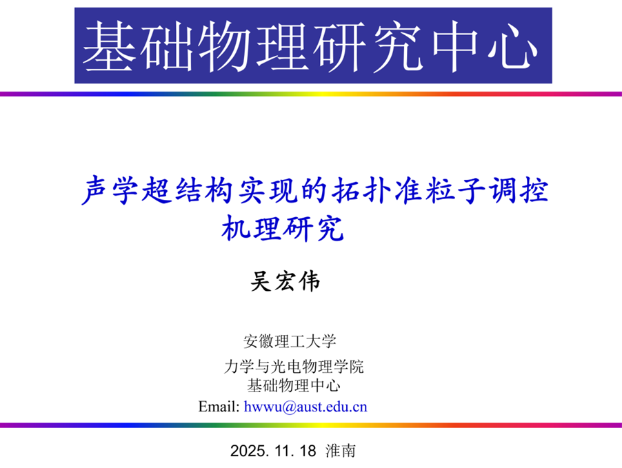 11月18日晚,基础物理中心举行《2025系列学术报告》第十四期,安徽理工大学基础物理研究中心吴宏伟教授,就题为“声学超结构实现的声斯格明子模式调控”做了学术报告。报告会由眭陶陶主持,中心成员及澳门六合彩三中三