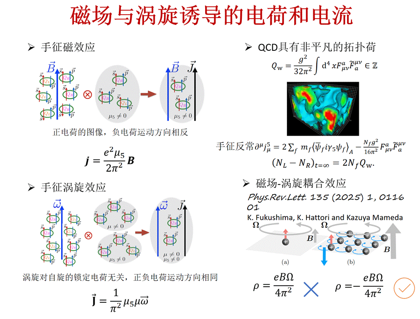 相对论重离子碰撞实验中,相对运动的带电原子核产生了极强的磁场。夸克胶子等离子体(QGP)同时也具的涡旋场。报告介绍了在重离子碰撞中,磁场和涡旋场诱导的几种电流和电荷,包括手征磁效应和手征涡旋效应。基于线性响应理论,在磁化QGP体系中,可以估计电荷密度关于涡旋的线性响应。考虑磁场弥散在全空间,关联函数在一圈水平具有平移对称性,并且具有限大小的关联长度。所以,QGP中某一点的电荷密度,由QGP的整体的涡旋轮廓所决定。磁场涡旋耦合效应形成径向的电荷分布,一种电荷在内部聚集,另一种电荷在外部聚集,该过程有径向电流;回顾CME电流是轴向的。磁场涡旋耦合效应可能对CME电流的测量有深远的影响。